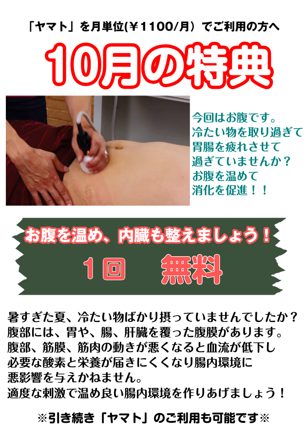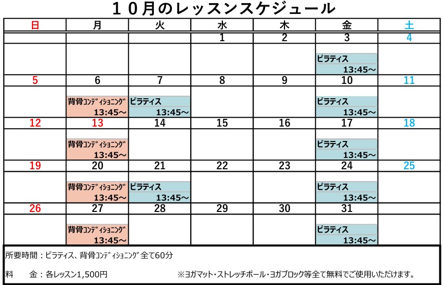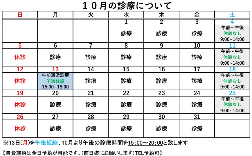 クリオ接骨院・鍼灸院の10月の診療スケジュールです。