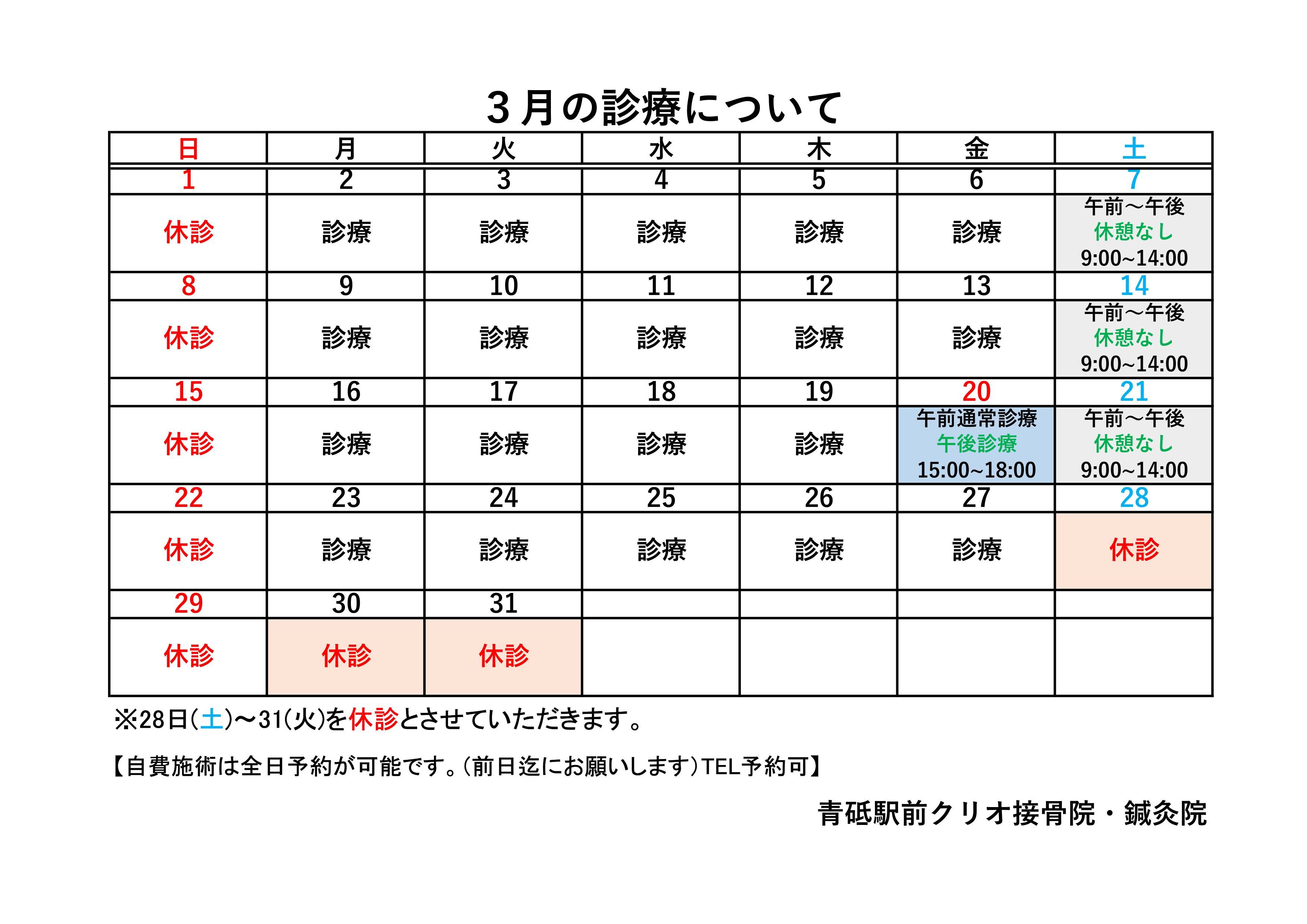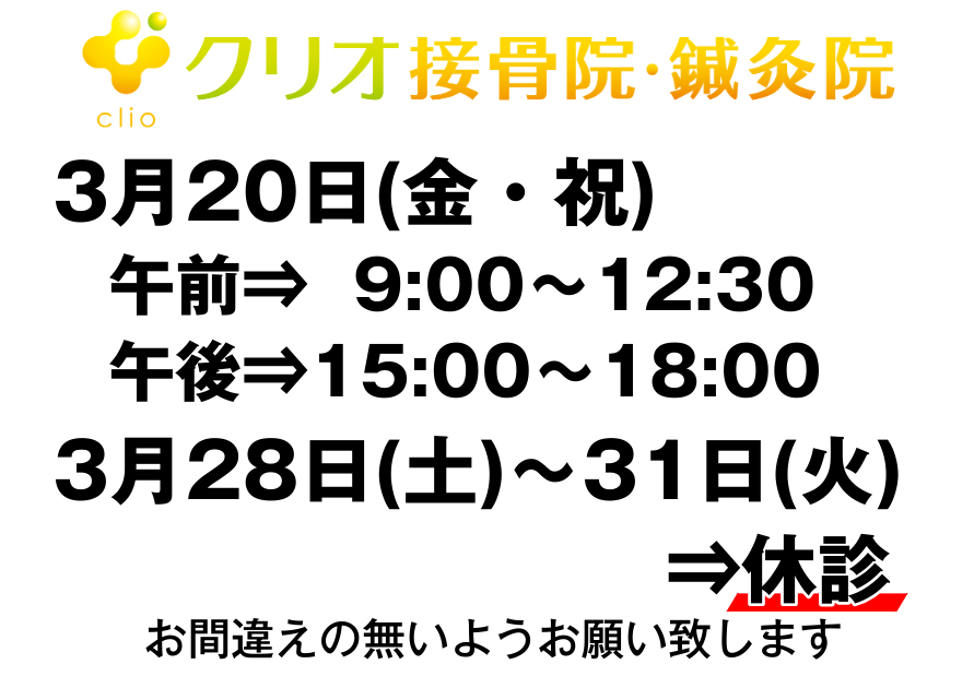 クリオ接骨院・鍼灸院の1月の診療スケジュールです。