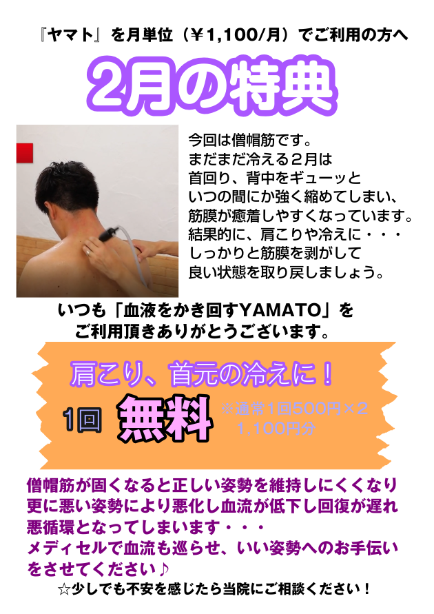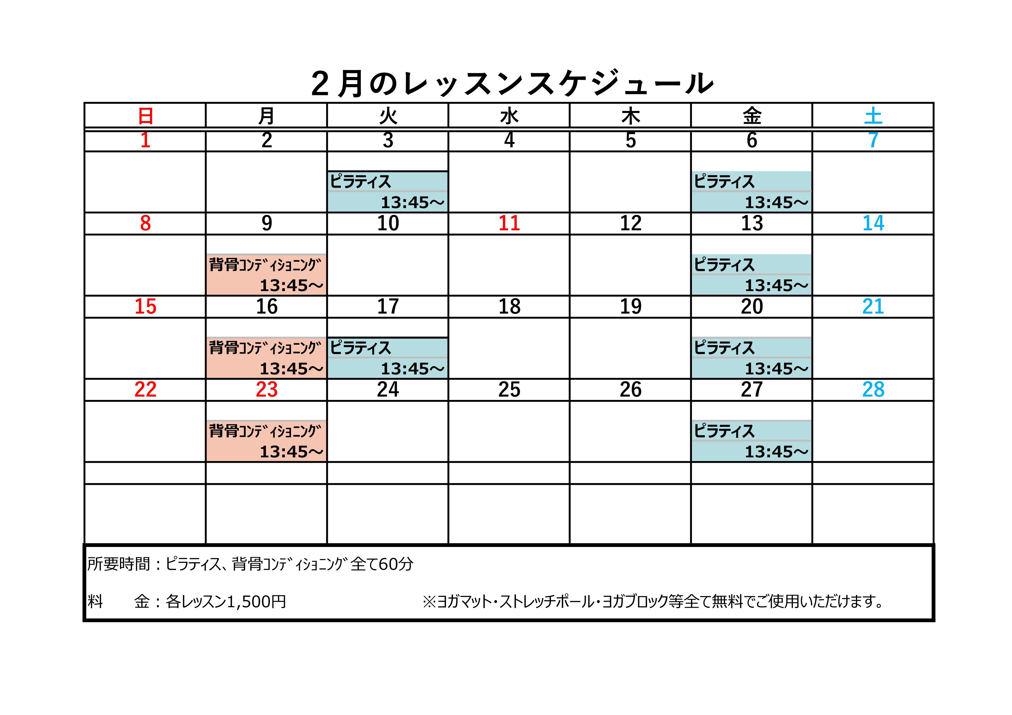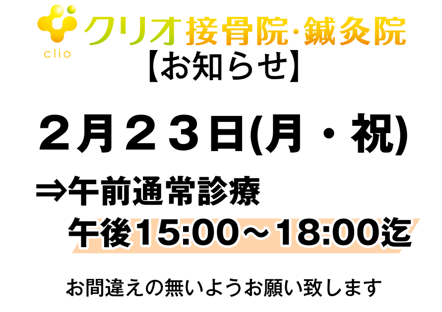 クリオ接骨院・鍼灸院の2月の診療スケジュールです。