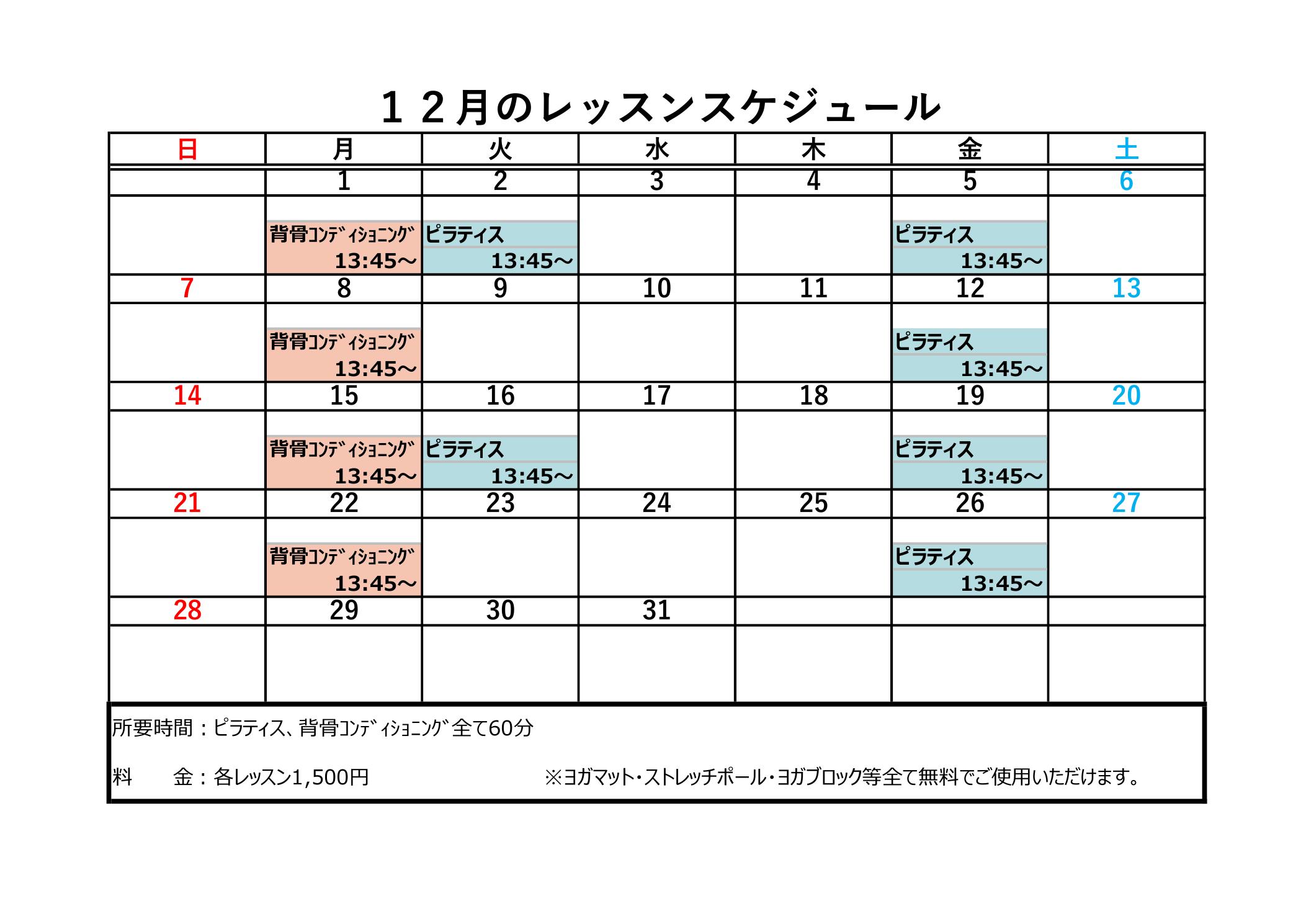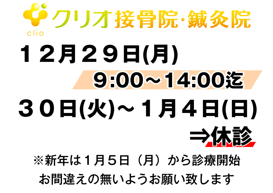 クリオ接骨院・鍼灸院の12月の診療スケジュールです。