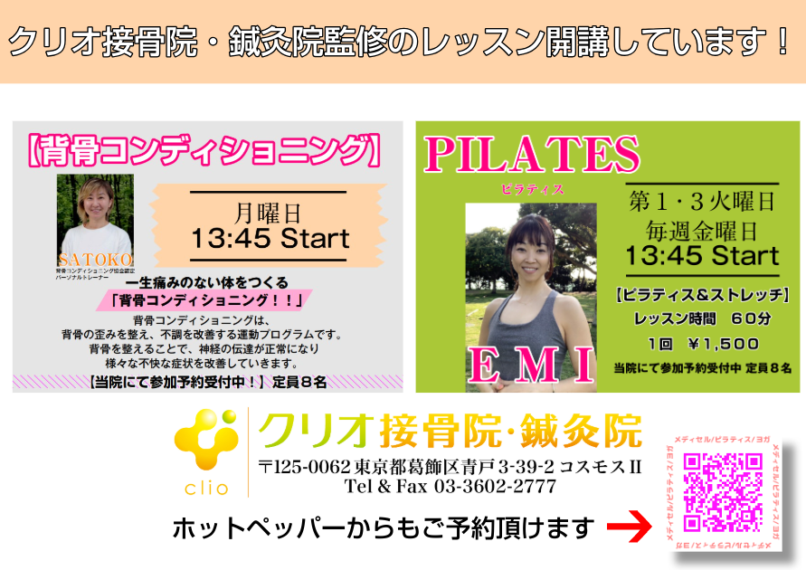 初めてご来院される方も予約不要ですので、ご都合のいい時間に御出でください。もちろん、姉妹店「クリコ青戸店」で行っている「ピラティス」「背骨コンディショニング」「歩行教室」も予約可能です。痛みを取り除くだけでなく、しなやかな身体、丈夫な身体、何より若さを保ちたい方、是非参加して下さい。