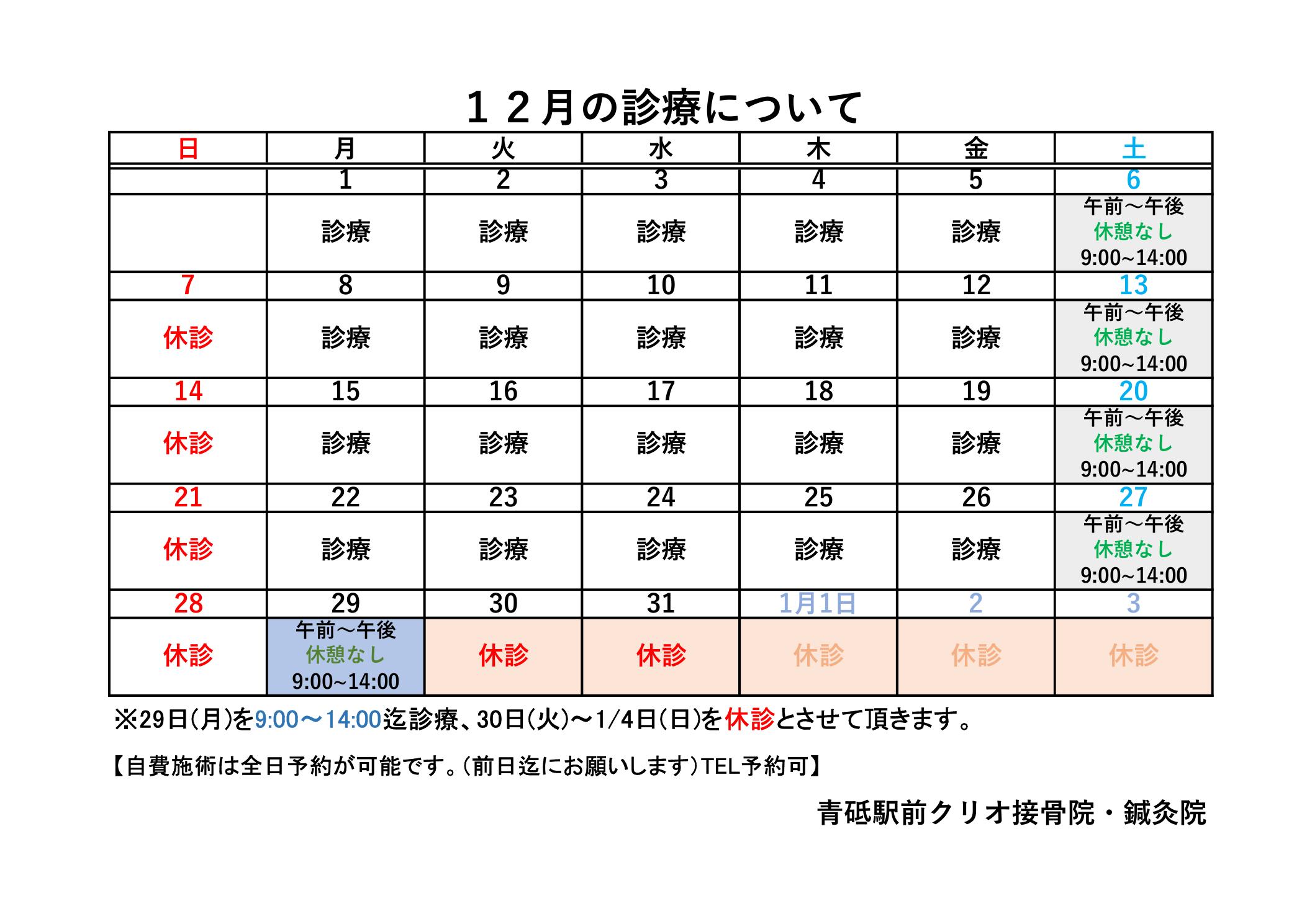 クリオ接骨院・鍼灸院の12月の診療スケジュールです。