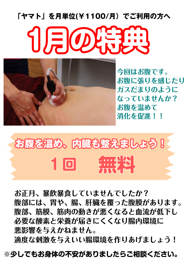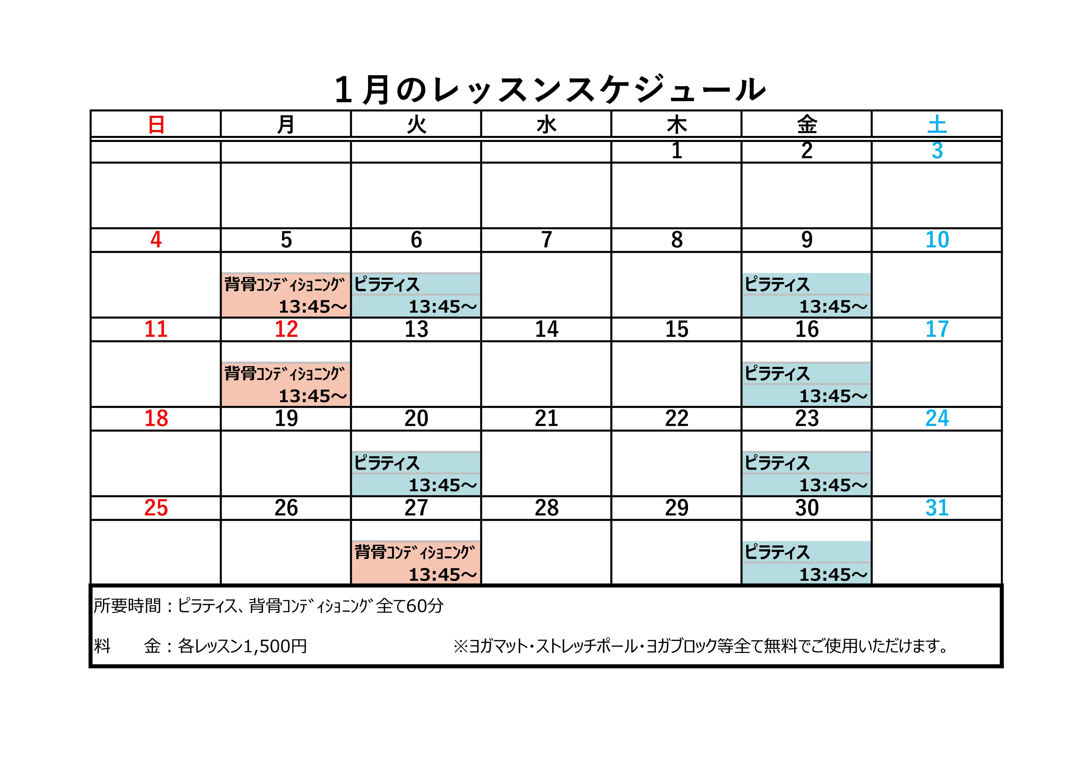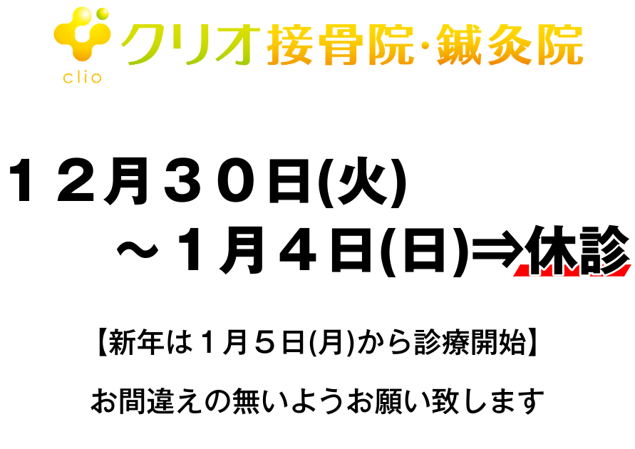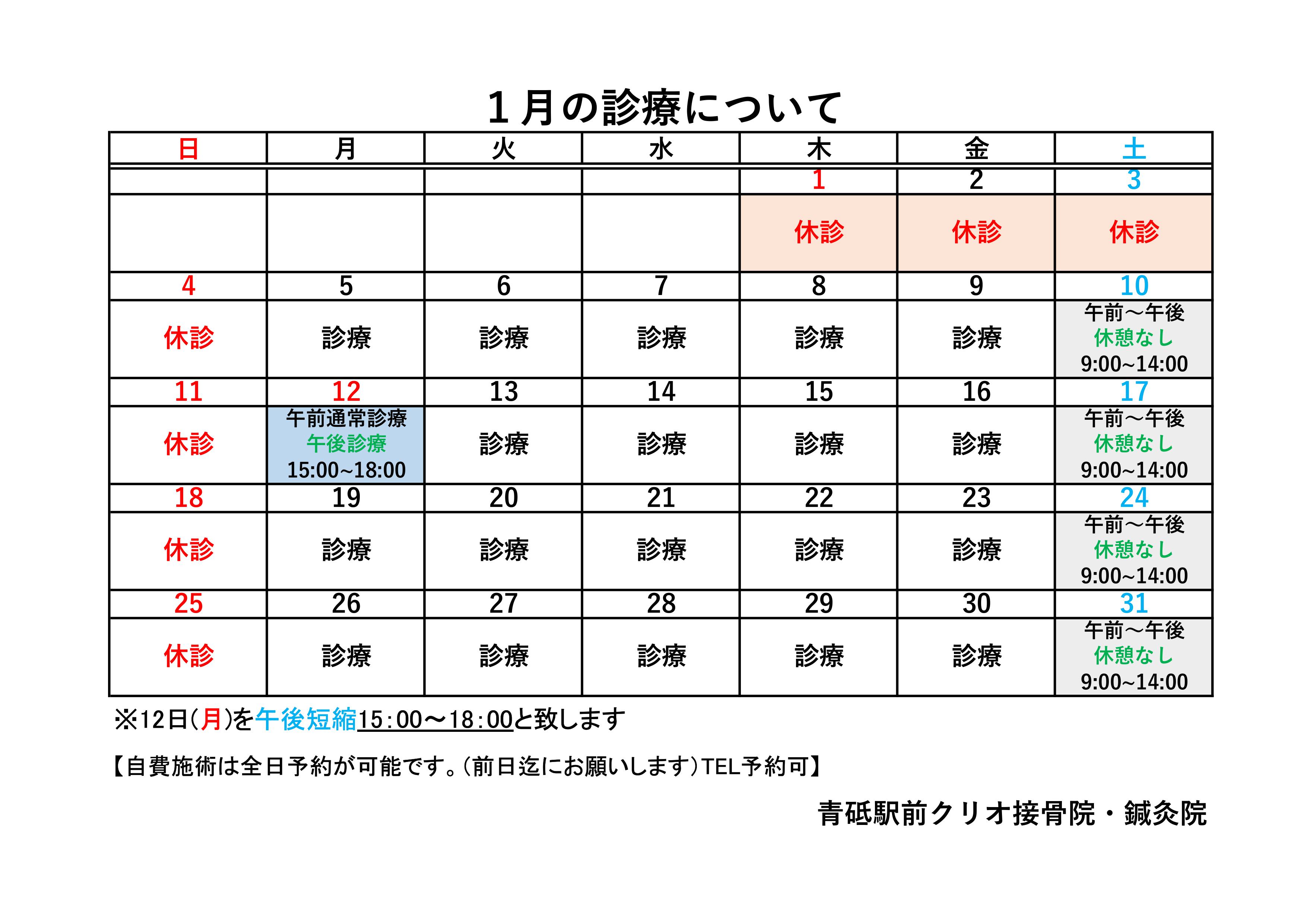 クリオ接骨院・鍼灸院の1月の診療スケジュールです。